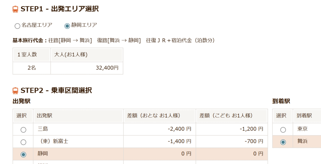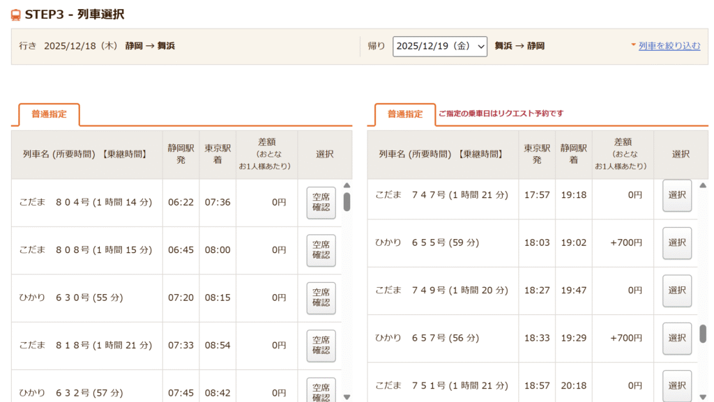 出発駅・日時を選択して申し込みに進めば、新幹線の指定席まで選べます。