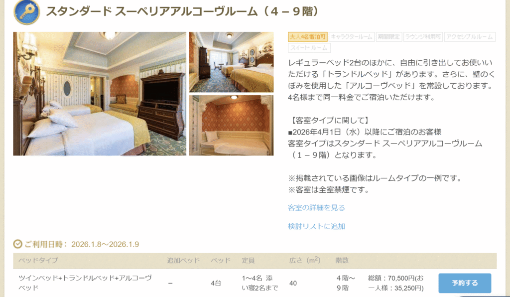 一般より早く予約が取れるのは本当に価値が高い!特にパークには人気のレストランが多いので、ここで予約が取れると長い待ち時間も解消できます。 - パーク内のショーレストランのホテル宿泊者枠が使える部屋も